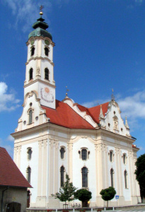 Baugeschichte der heutigen Anlage Im Herbst 1727 riss man die alte Kirche ab und Dominikus Zimmermann wurde mit dem Bau einer neuen Kirche beauftragt. Es entstand die erste deutsche Kirche mit ovalem Grundriss und Freipfeileranlage. Von außen kann man nicht erkennen, ob es sich um einen Zentralbau oder eine kreuzförmige Kirchenanlage handelt. Die vier barocken Giebel mit Voluten lassen einen kreuzförmigen Innenraum vermuten, die konvex geschwungenen Wandelemente zwischen Quer- und Längsachse lassen aber schon das Oval des Innenraums erahnen. Über dem Westportal thront ein Glockenturm mit Zwiebelhaube. Dominikus Zimmermann schuf eine einmalige Verschmelzung aus der ovalen Form des Sakralraums (im römischen Barock durch Bernini und Borromini populär geworden) und dem Vorarlberger Schema, welches ein Kirchenschiff vorsah, das durch zwei Reihen von Pfeilern gegliedert ist. Zimmermanns geniale Lösung: Dem ovalen Kirchenraum wird ein ebensolcher Ring aus zehn quadratischen Pfeilern einbeschrieben. Sie tragen die flache Kuppel des Innenraums. Zwischen dem Ring auf Pfeilern und der Außenwand entstand ein Umgang ohne echte Seitenschiffe.