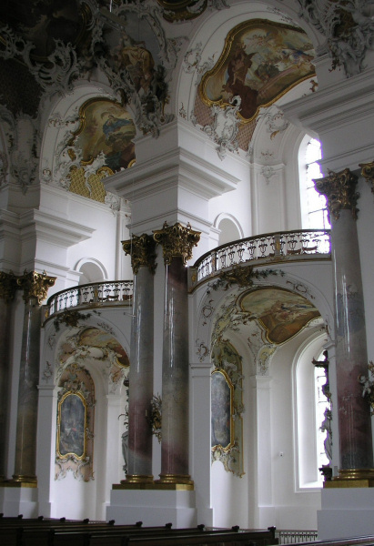 Baugeschichte der Barockkirche Die heutige Klosteranlage wurde 1668 begonnen. Vollendet wurde sie von Michael Thumb und Franz Beer. 1738 wurde die romanische Kirche abgebrochen und 1739 wurde mit dem Neubau der spätbarocken Kirche durch Josef und Martin Schneider begonnen. Bereits 1741 übernahm Johann Michael Fischer die Bauleitung. Die Kirche, Fischers größter Sakralbau, wurde 1765 geweiht. Zwiefalten ist eine spätbarocke Wandpfeilerkirche mit Querhaus und einschiffigem Chor. Das Querhaus in der Mitte teilt die Kirche in Langhaus und Chor, die jeweils eine Länge von 30 m besitzen. Die längsovalen Seitenkapellen im Hauptschiff werden von in den Mittelraum vorkurvenden Emporenbrüstungen begrenzt. Die Emporenbrücken sind die schönsten des deutschen Barock. Der Wessobrunner Stuckator Johann Michael Feuchtmayer d.J.schuf 1747-1758 über der Gebälkzone sehr ausgereifte Stuckornamente. Die Deckenfresken wurden vor allem von Franz Joseph Spiegler gemalt. In der Vorraumhalle malte Franz Sigrist die Decke aus, Meinrad von Ow schuf die Fresken in den Seitenkapellen mit ihren Emporen. An der Ostwand findet man ein von Jörg Syrlin d.J. 1520 geschaffenes Kruzifix. Die Orgel wurde 1958 von der Firma Reiser erbaut. | Die Baugeschichte der Zwiefaltener Klosterkirche