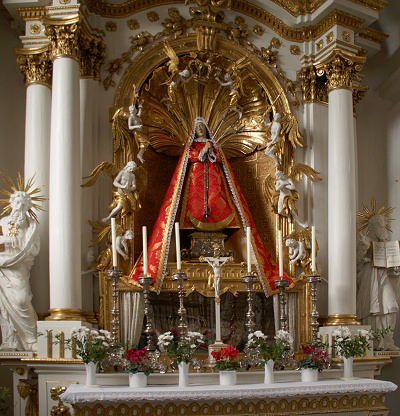 Die Marienstatue ist schon älteren Ursprungs. Ihr heutiges Aussehen mit den sieben Schwertern und dem wertvollen Stoffornat erhielt sie 1733.
