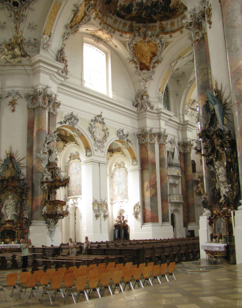 Der Stuck wurde von Johann Michael Feuchtmayer gefertigt, dem es in genialer Weise gelingt Lebensfreude zu vermitteln, ohne kitschig oder gar überladen zu wirken. Auch die 12 großen Figuren auf dem Hauptgesims stammen von Feuchtmayer. Beispiel 1 Beispiel 2 Beispiel 3 Beispiel 4 |
