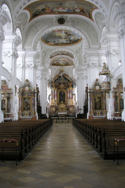 Kloster Kirchenbau Innenausstattung Fresken Chorgestühl Stuck Sehr kurze Übersicht: Die Kirche wurde 1777 begonnen und steht für den Übergang vom Barock zum Klassizismus. Sehenswert sind vor allem die Fresken von Januarius Zick. Stuckiert wurde die Kirche von Franz Xaver Feuchtmayer dem Jüngeren. |