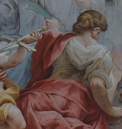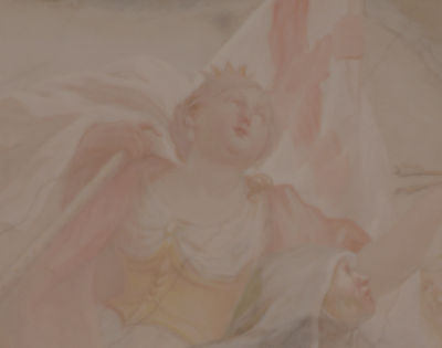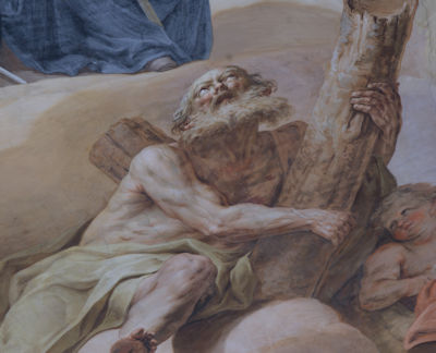 Nr. 11: Nicht weit von hier fährt der Bruder von Petrus und Schutzpatron der Kirche Andreas hochberühmt auf Grund seines schräg gestellten Kreuzes, wie auf einem Triumphwagen durch die Lüfte. Er thront wie ein Herrscher und ruht zugleich (regnantis oder regnatoris pro more ?) gestützt auf diesen Balken des Kreuzes: neben ihm sitzt ein Engel und zeigt die heiligen Netze des Fischers.