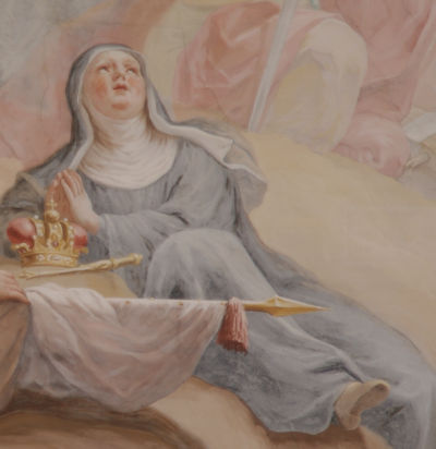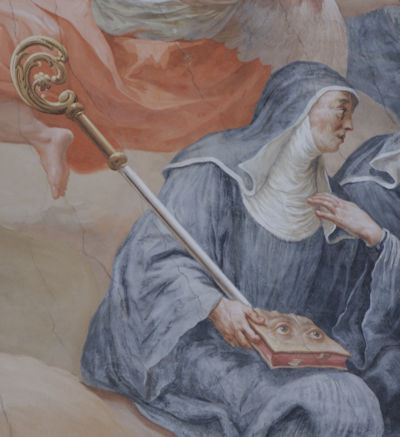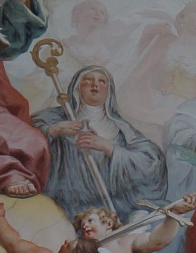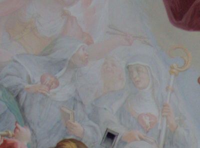 (* 1241/1242 † 19. November 1299) war Nonne und wurde im Kloster Helfta Kantorin und Leiterin der Klosterschule. Sie hatte ihr Leben lang mystische Visionen und Gotteserfahrungen. Attribute: Buch mit Taube Heilige Gertrudis (rechts) (* 6. Januar 1256 † 17. November 1302) war Nonne und Mystikerin. Stundenlang war sie den Menschen ihrer Umgebung Zuhörerin, Ratgeberin, Trösterin. Gleichzeitig war sie eine hochgebildete und künstlerisch begabte Frau. Attribute: Nonne, Herz mit dem Jesuskind, Buch, Kreuz, Feder. |