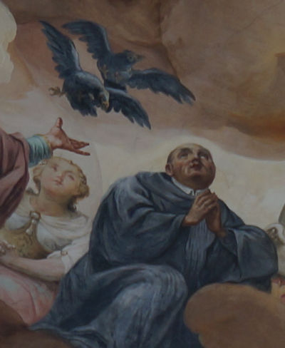 (* um 797; † 21. Januar 861) wurde im Kloster Reichenau unterrichtet und trat dort in den Benediktinerorden ein. Er lebte später als Eremit in der Schweiz, auf ihn geht die Gründung des Klosters Einsiedeln zurück. Als Meinrad von zwei Landstreichern erschlagen wurde, sahen dies zwei Raben, verfolgten die Mörder und führten sie vor Gericht. Aus diesem Grund sind auf dem Wappen des Klosters und des Dorfes Einsiedeln zwei Raben abgebildet. |