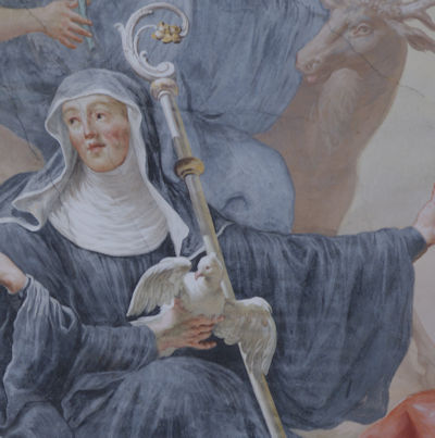 Nr. 14: Wie der Mond zwischen geringeren Gestirnen leuchtet unter den obengenannten Scholastica hervor, die große Schwester des großen Benedikt und seine erste Anhängerin; Sie war zugleich Ordensmutter; ihre jungfräuliche Ehre bezeugt eine ihrer Seite beigefügte Taube.