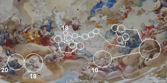 Die Tour beginnt bei Ernestus und beschreibt die Figuren auf der Nordseite des Freskos. Die Nummern beziehen sich auf die Versnummern in unserer Tabelle mit dem Carmen Epicum und seiner Übersetzung. |