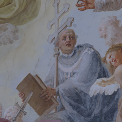 Nr. 24: Aber lass nun deine Augen weiterschweifen und fahre geradewegs fort die Helden des Himmelreiches anzuschauen. Sieh da, Blasius zeigt sich und Urbicus, die, indem sie ihr Blut vergossen, dieses Himmelreich gleichsam in einem Angriff eroberten; ihre heiligen Reliquien befinden sich in dieser Kirche. Blasius Urbicus