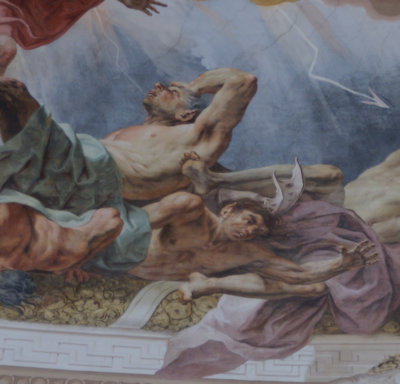 Nr. 22: Sieh zuerst und bewundere den glänzenden Sieg, den Michael über den großen Himmelsfürsten Luzifer und über seine Gefährten als stärkerer Führer davonträgt und wie er mit rächendem Schwert die Schuldigen vertreibt und vom Himmelsgewölbe verjagt; wie eine vom Blitz getroffene Eiche stürzen sie mit großem Geschrei, so wie jene Schar der Giganten wie in einem Heereszug von Jupiter getroffen herabstürzt.