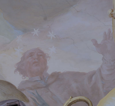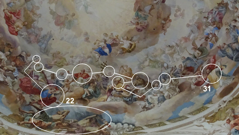 Nr. 27: (haerendem – haerentem? Besser: heredem –Erbe, Nachfolger) Nahe bei diesem in Wahrheit und Namen großen Nachfolger des Petrus sitzt jene überragende Gestalt, Ehre und Ruhm des Priesteramtes verkörpernd, Johannes Nepomuk, den Sterne krönen. Die Sterne umstrahlten einst das Haupt des im Wasser versunkenen, da ja dieser auch zu Lebzeiten wie ein Stern strahlte.