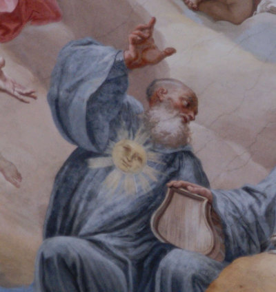 Nr. 36: Siehe, da ist Columbanus, Benedikts Sohn, Bischof von Luxeuil. Er trägt ein Bild der Sonne auf der Brust, (da ja seine Mutter bei seiner Geburt die Sonne sah, die mit ihren feurigen Strahlen die in der Mitte liegende Erde erleuchtet). Dem Abt Ottmar erzählt er, welch großes Wirken die göttliche Weisheit durch ihn und durch seine Gefährten der Welt erwiesen hat. (Luxeuil: Stadt in der Franche-Comté) Heiliger Kolumban
