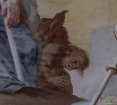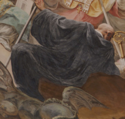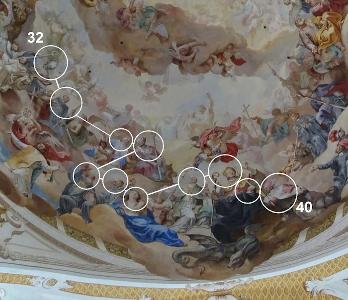 Nr. 32: Wenn du deine Augen von dort weiter und ein wenig nach oben lenkst kannst du Kilian erblicken, mit Mantel und Mitra ausgezeichnet, den das Frankenland zu Recht als Schutzpatron verehrt: an diesen schließt sich als Gefährte Placidus an und freut sich jetzt und für immer dasselbe Martyrium in Christi Namen erlitten zu haben als Märtyrer mit dem Märtyrer.