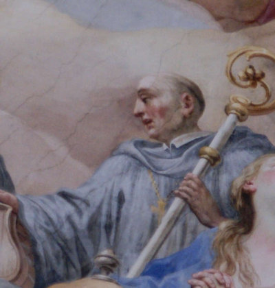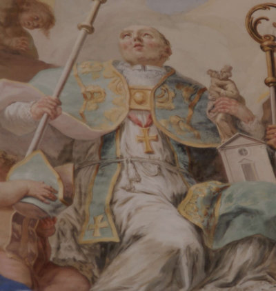 (* um 660 † 27. März 718) war Bischof von Worms sowie erster Bischof von Salzburg und Abt des dortigen St.-Peter-Stiftes. 696 erhielt er den Auftrag zur Missionierung des ganzen damaligen Bayern, vom Chiemgau bis hin nach Salzburg. Diese Gegend wird „Rupertiwinkel“ genannt. 13 Rupertkirchen gibt es in Bayern, ebenso viele in Kärnten, neun in der Steiermark, eine in Niederösterreich, eine in der Schweiz und zwei in Slowenien. Attribute in Neresheim: Mutter-Gottes-Statue in der Hand und eine Kirche. Sie beziehen sich auf die Mutter-Gottes-Wallfahrt in Oettingen, die auf Rupert zurückgeht. |