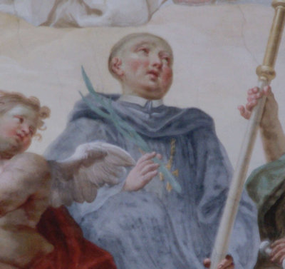 († um 545) wurde schon im Alter von 5 Jahren zur Erziehung zu Benedikt von Nursia nach Subiaco gebracht und ging mit auf den Montecassino zur Klosterneugründung. Als Kind wurde er von Maurus, der durch Gebete Benedikts befähigt wurde über das Wasser zugehen, vor dem Ertrinken gerettet. Attribute: Mönch mit Büchern und Totenkopf |